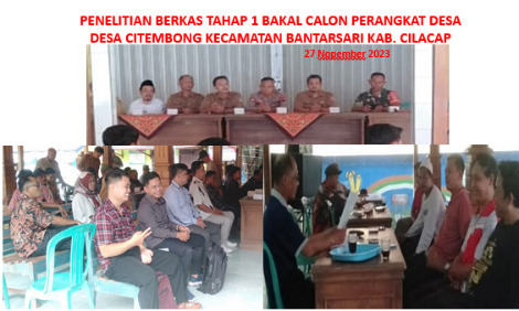 tahapan penelitian berkas bakal calon perangkat desa Desa Citembong yang akan dilakukan pada tanggal 27 November 2023 oleh panitia Pengangkatan Perangkat Desa Desa Citembong, didampingi panwacam Kecamatan Bantarsari, dengan jumlah peserta untuk Kadus Karangtengah sebanyak 2 orang, Kadus Bonjoksaga sebanyak 3 orang, dan Kepala Urusan Keuangan sebanyak 4 orang. Satu bakal calon telah lolos seleksi, namun masih ada kekurangan terutama terkait legalisir ijazah, dan batas akhir pelengkapan berkas adalah tanggal 5 Desember 2023.